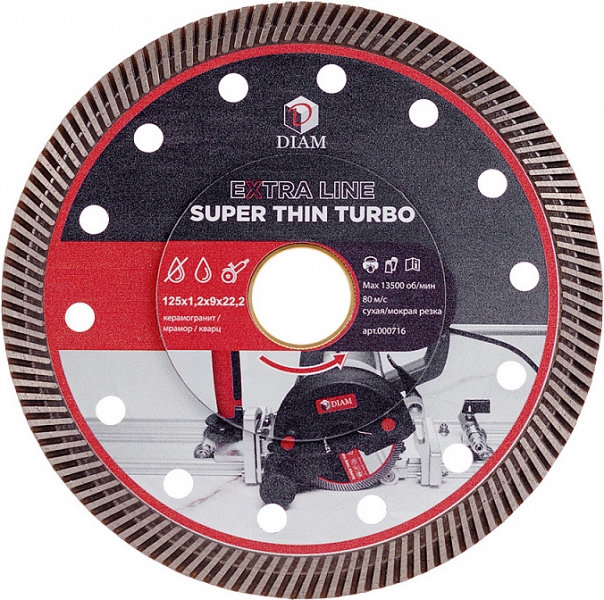 Алмазный диск Diam Extra Line Turbo Super Thin 125 мм (Диам Экстра Лайн Турбо Супер Тин 125 мм) – специальный алмазный круг для сухой и мокрой резки керамики (керамической глазурованной плитки), керамогранита, мрамора, кварца, на ручном электроинструменте и системах раскроя крупного формата.