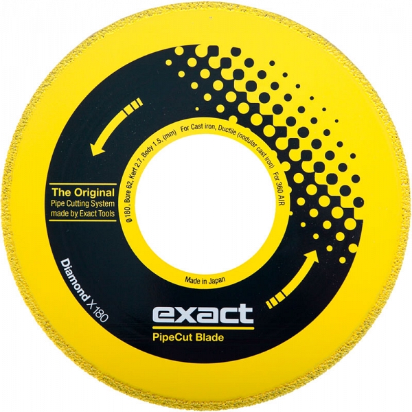 Алмазный диск Exact Diamond X180 (Экзакт Диамонд Икс180) – сверхмощный специальный режущий диск с алмазной крошкой для резки труб из чугуна, ковкого чугуна (чугуна с шаровидным графитом), чугуна с бетонным слоем, стекловолокна. Подходит для электрических труборезов Exact PipeCut 360 Pro Series, 360 Air.
