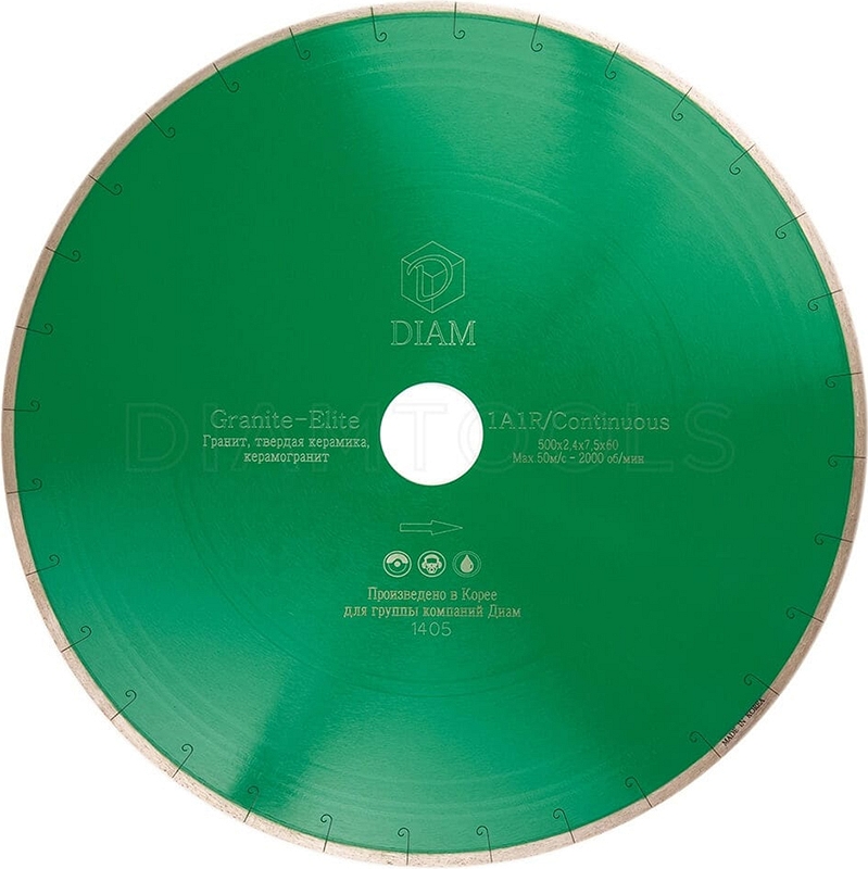 Алмазный отрезной круг Diam Extra Line 1A1R Корона Granite-Elite 500 мм (Диам Экстра Лайн 1А1Р Корона Гранит-Элит 500 мм) – премиальный алмазный диск для мокрой резки гранита, керамогранита, твердой керамики, кварцевого агломерата, оникса, мрамора, габбро, лабрадорита, базальта и других пород твердого натурального камня на камнерезных станках, стенорезных машинах, швонарезчиках с подачей воды. За долгое время зарекомендовал себя с отличной стороны у многих мастеров, как инструмент, обеспечивающий очень качественное выполнение задач практически по всем твердым материалам, при этом имеет очень большой ресурс и скорость работы.