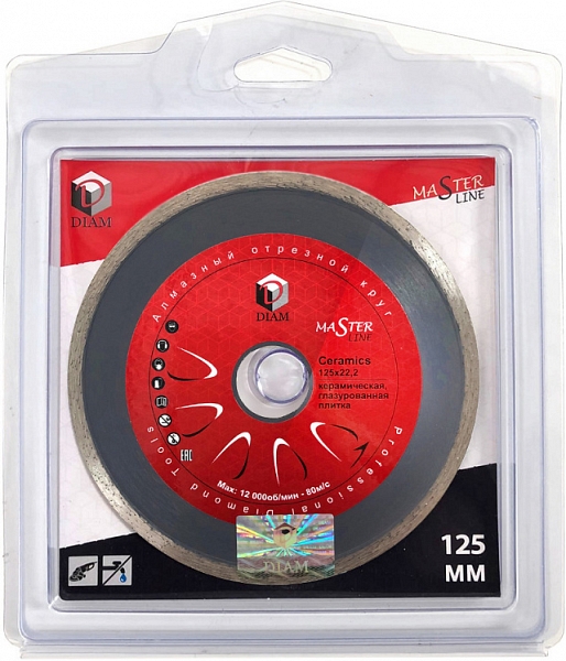 Алмазный отрезной круг Diam Master Line 1A1R Корона Ceramics 125 мм (Диам Мастер Лайн 1А1Р Корона Керамикс 125 мм) – универсальный алмазный диск со сплошной режущей кромкой для резки керамической и глазурованной плитки ручными углошлифовальными машинами (ушм, болгарками), штроборезами и системами резки крупноформатной плитки без подачи воды при проведении отделочных работ.