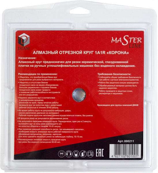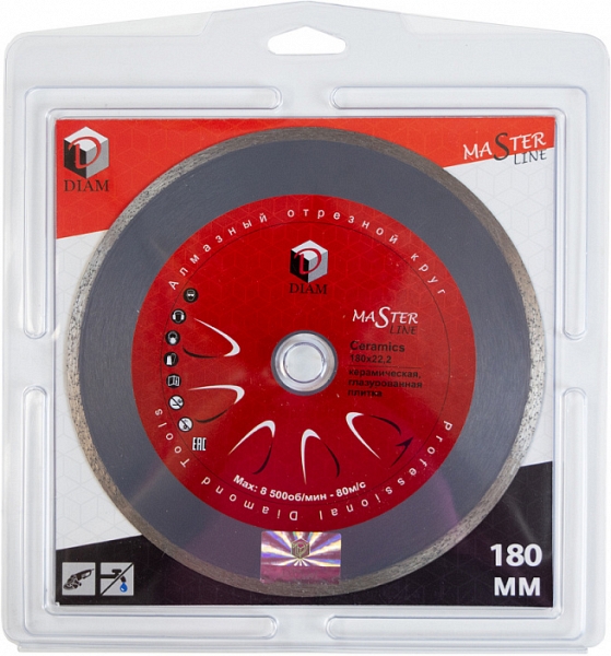 Алмазный отрезной круг Diam Master Line 1A1R Корона Ceramics 180 мм (Диам Мастер Лайн 1А1Р Корона Керамикс 180 мм) – универсальный алмазный диск со сплошной режущей кромкой для резки керамической и глазурованной плитки ручными углошлифовальными машинами (ушм, болгарками), штроборезами и плиткорезами электрическими без подачи воды при проведении отделочных работ.