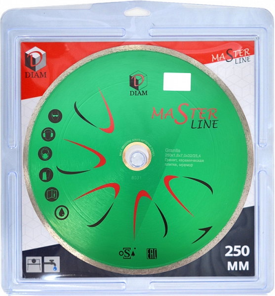 Алмазный отрезной круг Diam Master Line 1A1R Корона Granite 250 мм (Диам Мастер Лайн 1А1Р Корона Гранит 250 мм) – универсальный недорогой алмазный диск высокого качества со сплошной режущей кромкой для резки гранитной, мраморной и керамической плитки болгарками (ушм) и штроборезами с подачей воды.