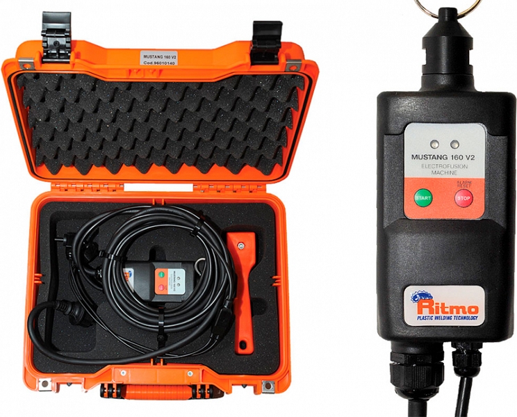 Аппарат для электромуфтовой сварки пнд труб безнапорных трубопроводов Ritmo Mustang 160 V2 (Ритмо Мустанг 160 В2) предназначен для сварки безнапорных и низконапорных или малонапорных ПНД (ПЭНД / ПЭВП) / HDPE трубопроводов низкого давления Ø 32 – 160 мм из полиэтилена низкого давления или высокой плотности с помощью электромуфт (электрических муфт, электромуфтовых фитингов) с закладными нагревательными элементами Vulcathene-Eurofusion, Akatherm-Eurofusion, Geberit, Valsir, Coes, Waviduo.