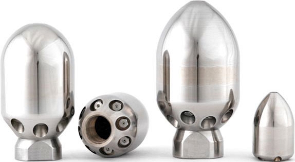 - Изготовлены из особо износостойкой, не поддающейся коррозионному воздействию, закаленной, нержавеющей стали с использованием оптимизированной системы "3D Гидромеханикс": насадки для очистки канализационных сетей были разработаны с использованием оптимизированного "3D Гидромеханизма" – вода, выходящая из шланга высокого давления, плавно поворачивается на 180º, поступает во внутреннюю полость насадки и направляется непосредственно в керамические сопла по пяти осевым каналам (отшлифованных и с высокой точностью обработанных на станке типа CNC), а не трубок или желобов