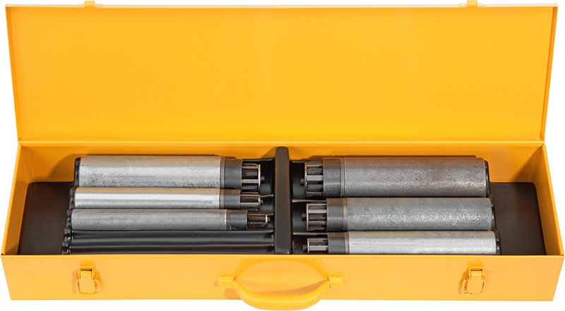 Комплект автоматических зажимов для коротких труб Rems Nippelfix Set 1/2"-3/4"-1"-1 1/4"-1 1/2"-2" (Ремс Ниппельфикс Сет 1/2"-3/4"-1"-1 1/4"-1 1/2"-2") – внутризажимные трубные ниппельные держатели с внутренним автоматическим зажимом для коротких отрезков (остатков, кусков) труб Ø 1/2", 3/4", 1", 1 1/4", 1 1/2", 2". Для резьбонарезных станков с открывающимися резьбонарезными головками: для токарных резьбонарезных станков, станков с вращающейся резьбонарезной головкой и устройств для нарезания резьбы.