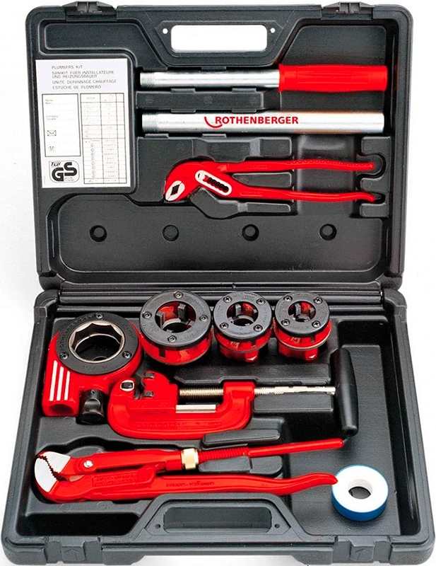 Набор сантехнического инструмента Rothenberger Sani Kit (Ротенбергер Сани Кит) предназначен для проведения ремонтных и монтажных работ на стальных трубах Ø до 1 1/4", таких, как: резка; нарезание резьбы; монтаж, закручивание, ослабление, уплотнение резьбовых соединений. Мобильное использование на стройке. Идеальный практичный набор для монтажа!