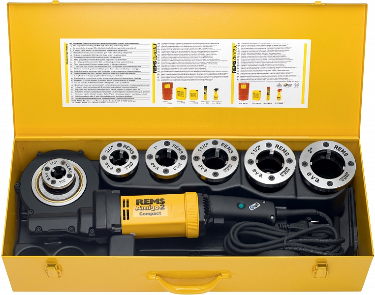 - Rems Амиго 2 Компакт Сет. Электрический резьбонарезной клупп с быстросменными головками для трубной резьбы 1/8" – 2", 16 – 50 мм, болтовой резьбы 6 – 30 мм, 1/4" – 1". Для правой и левой резьбы. Привод, опорный бугель, не требующий технического обслуживания редуктор, надежный, мощный, универсальный двигатель 230 В, 50 – 60 Гц, 1200 Вт, с увеличением мощности посредством автоматической перестановки угольных щеток. Максимально потребляемая мощность до 1800 Вт. Защита от перегрузки. С быстросменными резьбонарезными головками Rems Ева для конической резьбы ISO 7-1, EN 10226 (DIN 2999, BSPT) R правой и резьбы на электроизоляционных трубах согласно EN 60 423 М. В прочном стальном чемодане.