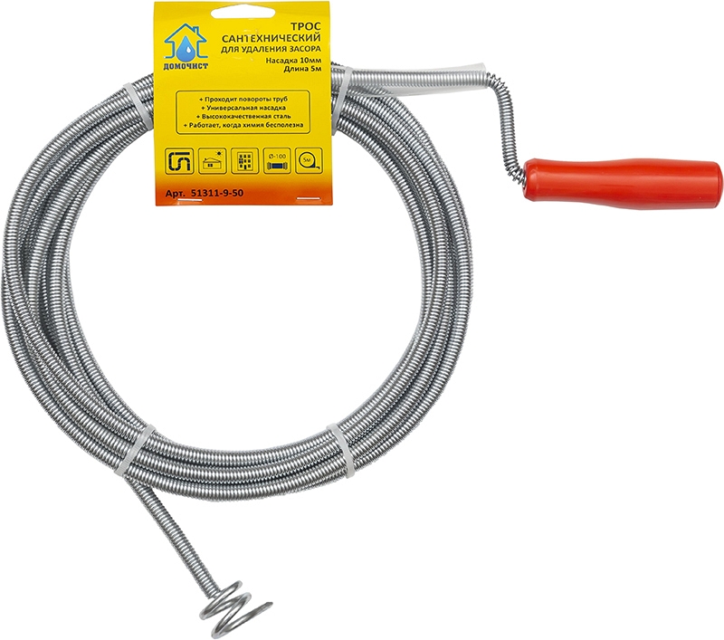 Трос сантехнический для удаления засоров в трубах Домочист 9 мм × 5 м (Domochist 9 mm × 5 m) – ручное приспособление для удаления засоров в канализационных трубах Ø до 100 мм, длиной до 5 м бытовой канализации.