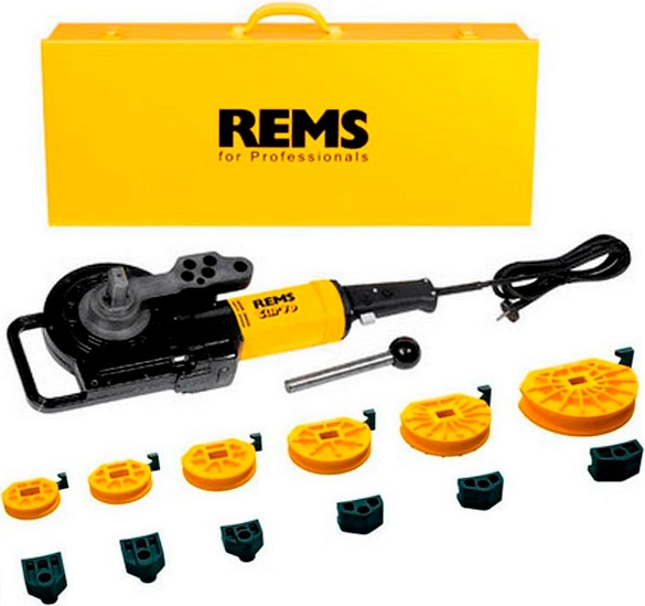 - Rems Курво Базовый Пакет (без гибочных сегментов и элементов скольжения). Электрический трубогиб Ø 10 – 40 мм, 1/4" – 1 3/8", до 180°. Жесткие, полужесткие, гибкие медные трубы, в том числе тонкостенные, Ø 10 – 35 мм, 3/8" – 1 3/8", мягкие медные трубы в оболочке, в том числе тонкостенные, Ø 10 – 18 мм, толстостенные медные трубы K65 для холодильной техники и систем кондиционирования EN 12735-1 Ø 3/8" – 1 3/8", трубы систем запрессовки из нержавеющей стали Ø 12 – 28 мм, углеродистой стали, в том числе в оболочке, Ø 12 – 28 мм, мягкие трубы из прецизионной стали Ø 10 – 28 мм, стальные трубы EN 10255 Ø 1/4" – 3/4", электромонтажные трубы EN 50086 Ø 16 – 32 мм, композитные трубы Ø 14 – 40 мм и т. д. Электрический привод с не требующим технического обслуживания редуктором с проскальзывающей предохраняющей муфтой, универсальный двигатель 230 В, 50 – 60 Гц, 1000 Вт с бесступенчатым, электронным, толчковым выключателем, правый и левый ход, палец-упор. В прочном стальном чемодане.