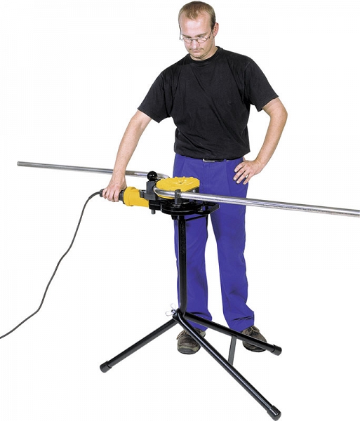 Компактный, удобный электроинструмент для гибки труб. Очень легкий, приводной двигатель всего 8 кг. Применим везде. Никаких предварительных установок. Простая, быстрая работа, например, 90° трубу Ø 22 мм гнет всего за 6 секунд. Быстрая подача и замедленный ход для более точного гиба. Позволяет получение перегибов, резких изгибов, U- и S-образных элементов. Передвижная подставка для машины с регулировкой высоты. - Привод: